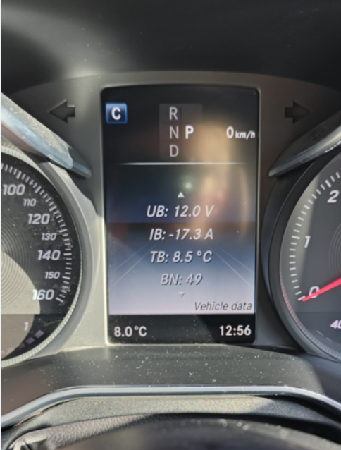 Greetings, everyone! I require assistance in diagnosing the issue with my battery. I am receiving the persistent yellow battery warning in the vehicle, which occasionally dissipates after a thorough drive but often reappears shortly thereafter. The battery endures a challenging existence, as the car is infrequently driven, resulting in limited time spent in a charged state. I apologise for the information overload; nonetheless, I am providing a timetable and battery statistics. A new primary battery was installed at Mercedes 2.5 years ago, and all is functioning well. A few months later, the start/stop function became dormant once more; nevertheless, everything else was functioning OK, and I was indifferent to the start/stop feature, so we continued as usual. Approximately one year ago, I experienced an event in which I left the vehicle parked on a frigid night with the battery warning illuminated, resulting in a failure to start and necessitating a jump start. Intermittently, particularly in winter when the battery is depleted, the vehicle displays a "collision assist not operational" message, which resolves autonomously after the battery is recharged. A few weeks prior, I drove the car for approximately 40 minutes, and several hours later, I received a battery warning. I took it out once more for an additional 20-30 minute trip, and there were no concerns with an extended interval before the next drive. Yesterday, the battery alert illuminated, prompting me to drive the car for 40 minutes. Several hours later, the battery warning reappeared... Operated the vehicle for an additional 20 minutes, and the warning reappeared later that evening. Operated the vehicle again this morning for 25 minutes and documented the battery statistics, which appeared suboptimal. Battery statistics: Prior to initiating the vehicle (by pressing the start button once to activate the radio and other systems) with a battery warning, I am uncertain whether the -15A reading is typical.