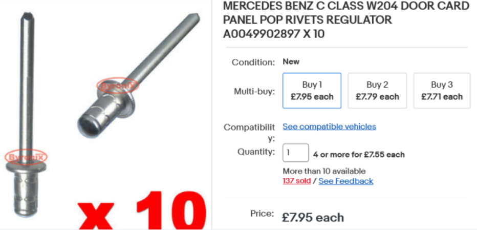 However, it is essential that the rivets in question of exceptional quality, since they are intended for use in a Mercedes automobile. However, the aforementioned listing might be considered a significant value proposition in comparison to this other option. The eBay listing offers a genuine Mercedes blind rivet, specifically designed for the Cls Sprinter 906, C204, C218, S204, and S212 models. The blind rivet is identified by the part number 0049902897.