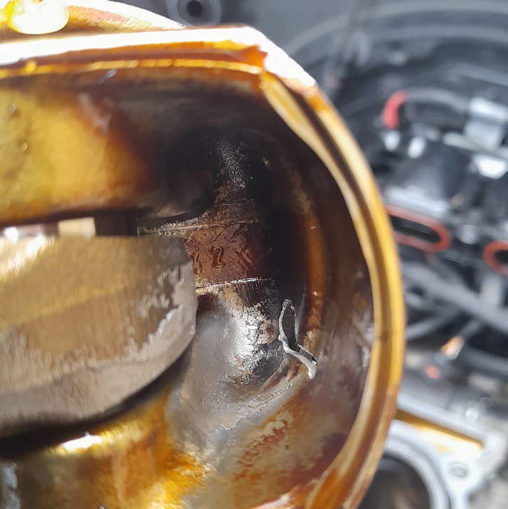 19. If there is no compression on a single cylinder, it may indicate either a malfunctioning valve or a damaged piston. The damage to the piston cannot be seen until the head is removed. I will provide a photograph of engines without compression. Regardless, the head must be removed and there is no room for speculation. What is the rationale for substituting a used head from a different vehicle when the damaged valve can be easily replaced or the head can be refreshed? If it is a piston, then a bottom end refresh would be necessary. Personally, I believe it would be less troublesome. The appearance of your piston is a result of its saturation with gasoline caused by the absence of compression.