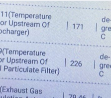 After analysing the available data, I saw that under comparable operating circumstances, the fill rate over a 60-mile distance on the highway climbed by 7% while driving. However, during the latest instance, covering the same 60-mile distance on the motorway resulted in a fill rate of 38%. To me, it represents a significant disparity in the pace at which the diesel particulate filter (DPF) is being filled. Both travels exhibited remarkable similarities, such as the absence of traffic, a consistent speed of 70 miles per hour, the vehicle being completely warmed up, and the use of Shell V-Power diesel fuel. These are photographs of the temperature sensors under maximum workload as the rate of filling grew rapidly.